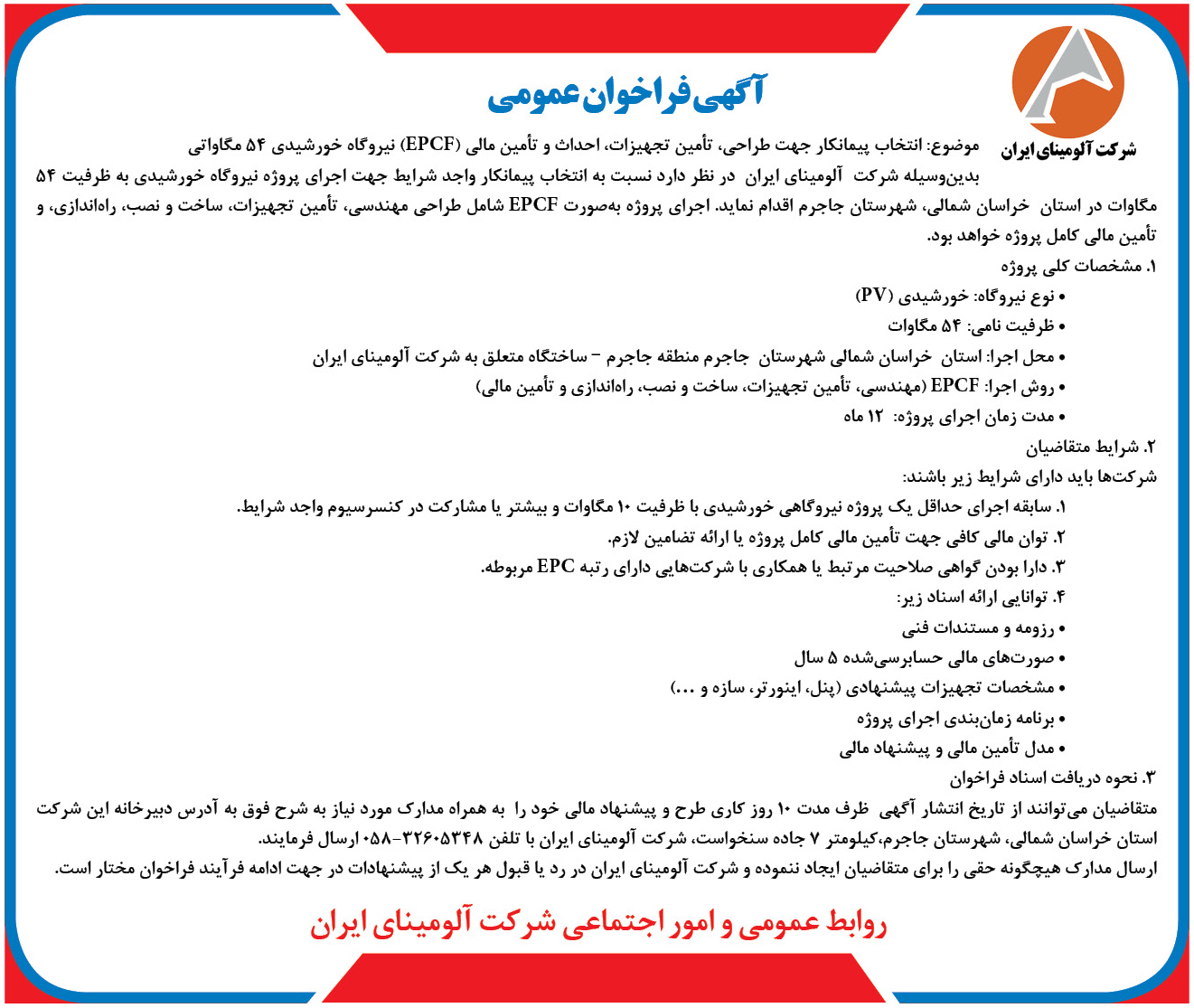 آگهی فراخوان جذب سرمایه گذار در شرکت آلومینای ایران منتشر شده در روزنامه اترک